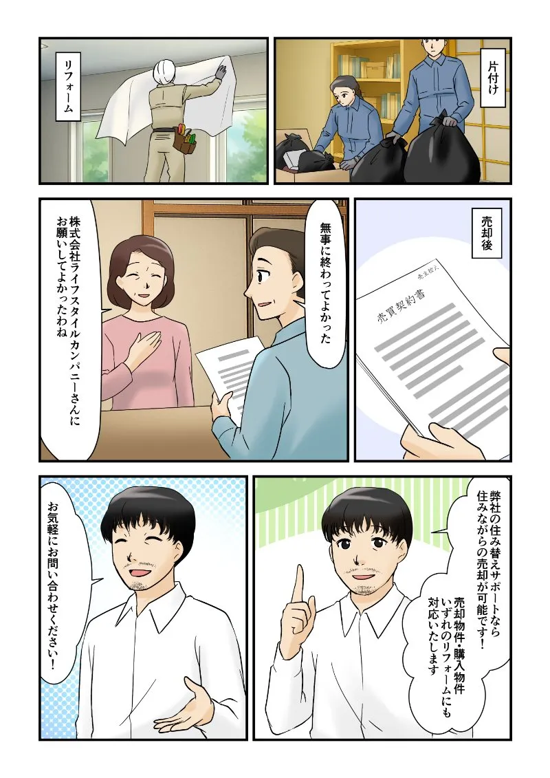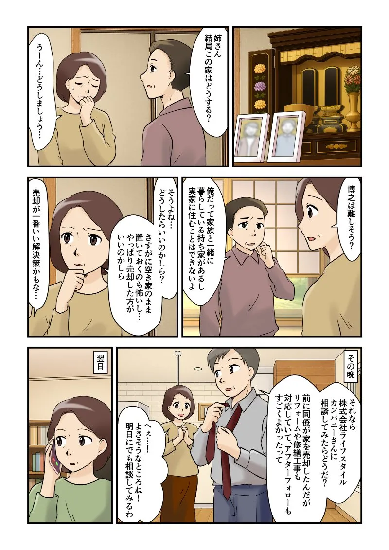 旦那「それなら株式会社ライフスタイルカンパニーさんに相談してみたらどうだ?前に同僚が家を売却したんだが、リフォームや修繕工事も対応していて、アフターフォローもすごくよかったって」